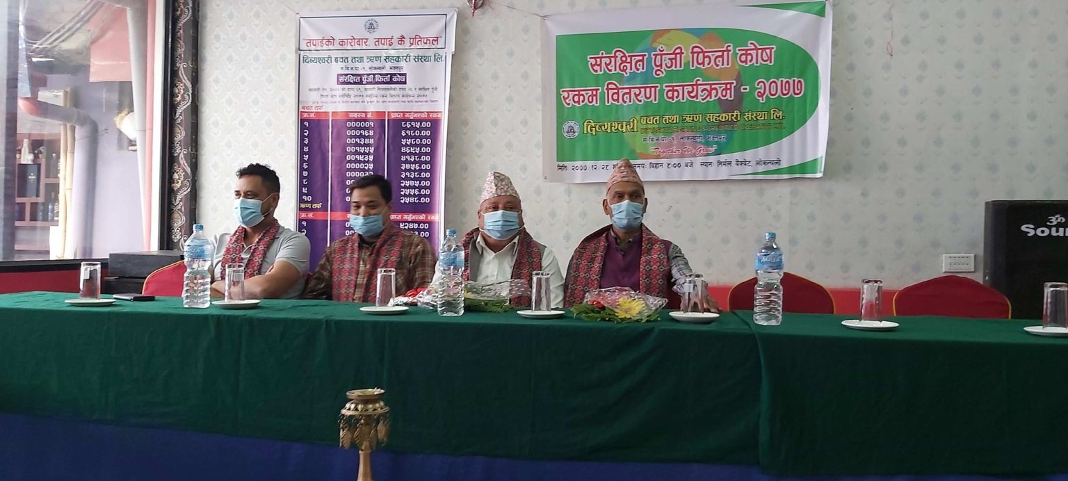 संरक्षित कोष यसरी बितरण गरियो सहकारी संस्थाहरु गैर पुजीवादी अर्थतन्त्रको अबधारणामा स्थापित र संचालित भएका हुन्छन् । नेपालमा पुजिबादमा मान्यता राख्ने र समाजबादी भनाउदाहरु दुबै क्षेत्रकाले सहकारी खोलेका छन् । तर, कतिपय पैसा उठाउने र सहकारी मान्यता बिपरितको काम गरि काम गरिरहेकाहरु पनि छन् । तर, कतिपय सहकारी संस्थाहरुले प्रशंसा पनि कमाएका छन् । सदस्यको हितमा काम गरेर सदस्यहरु माझ लोकपृय बनेका छन् । मध्यपुर ठिमी १ लोकन्थलीमा संचालित दिब्य श्वरी बचत तथा ऋण सहकारी संस्था पनि ती मध्य एक मान्न सकिन्छ । शनिबार संस्थाले एक आकर्षक तर आफ्ना सदस्य केन्द्रित कार्यक्रमको आयोजना गर्यो । उसले संरक्षित पुजी फिर्ता कोष रकम बितरण कार्यक्रम -२०७७ आयोजना गरि उत्कृष्ट सदस्यहरुलाइ सम्मानपुर्बक रकम हस्तान्तरण गर्यो । सभामा जानकारी गराए अनुसार यो सहकारी ऐन नियामाबलीमा ब्यबस्था छ तर सहकारीहरुले अर्को तरिकाबाट यो शिर्सकमा खर्छ देखाउने गर्छन् । यसर्थ यो कार्यक्रम भक्तपुरमा पहिलो र नमुना योग्य हो ।