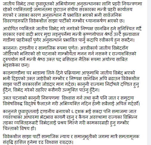कानुनतः दण्डनीय र सामाजिक रूपमा पूर्णतः अस्वीकार्य जातीय विभेदसँग जोडिएको भनिएको सो घटनाको गाम्भीर्यता मनन गर्न नसक्ने र राज्यशक्तिकाे दुरुपयोग गर्ने मन्त्री श्रेष्ठ उक्त पद बसिरहन नैतिक रूपमा अयोग्य साबित भइसकेका छन्।”