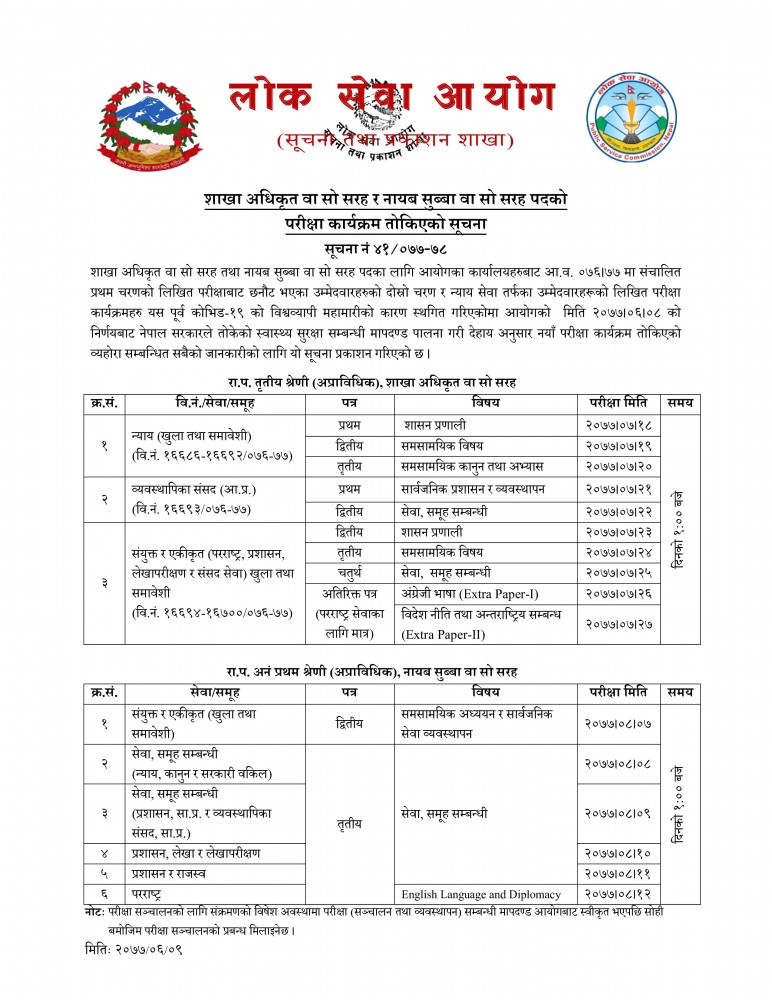 शाखा अधिकृत वा सो सरह तथा नायब सब्बा वा सो सरह पदको आ.व. ०७६।७७ मा संचालित प्रथम चरणको लिखत परीक्षाबाट छनौट भएका उम्मेदवारहको दोस्रो र न्याय सेवा तर्फका उम्मेदवारहरुको लिखित परीक्षाको नयाँ परीक्षा कायर्क्रम तोकिएको लोकसेवा आयोगले जनाएको छ ।