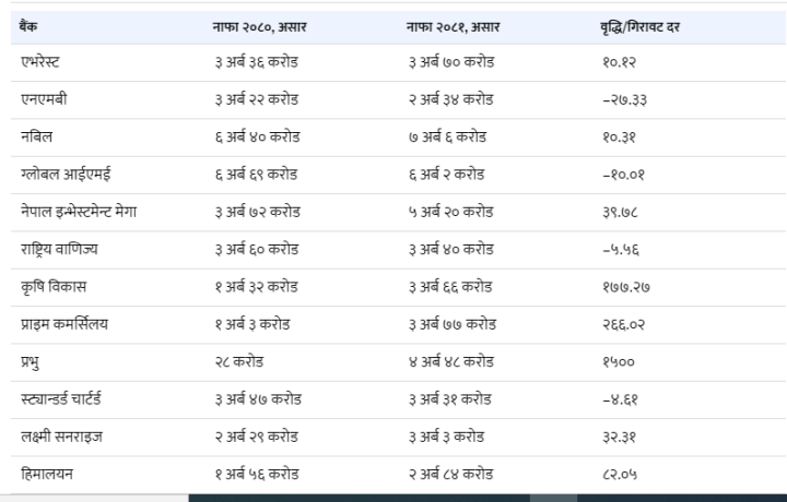 १० बैंकको नाफा बढेको देखिन्छ भने १० को घटेको छ । यद्यपि मर्ज तथा एक्वीजिसनका कारण केही बैंकको नाफा बढेको देखिए पनि वास्तविकतामा घटेको छ । प्रभु बैंकको नाफा वृद्धिदर सबैभन्दा उच्च छ । सो बैंकको नाफा एक वर्षकै अवधिमा १६ गुणा बढेको छ । एनआईसी एसिया बैंकको नाफा भने सबैभन्दा धेरै ६८।९ प्रतिशत घटेको छ ।