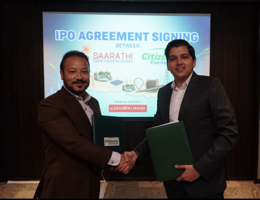 नेपालको केबल तथा तार उत्पादनमा अग्रणी कम्पनी सारथी केवल इन्डष्ट्रीज लिमिटेड र सिटिजन्स क्यापिटल लिमिटेडबीच प्रारम्भिक सार्वजनिक निष्कासन (IPO) का लागि सम्झौता भएको छ । सम्झौता पत्रमा सारथी केवल इन्डष्ट्रीजका अध्यक्ष श्री अंकित भुसाल र सिटिजन्स क्यापिटलका प्रमुख कार्यकारी अधिकृत श्री सबिर बादे श्रेष्ठले हस्ताक्षर गरेका हुन् ।