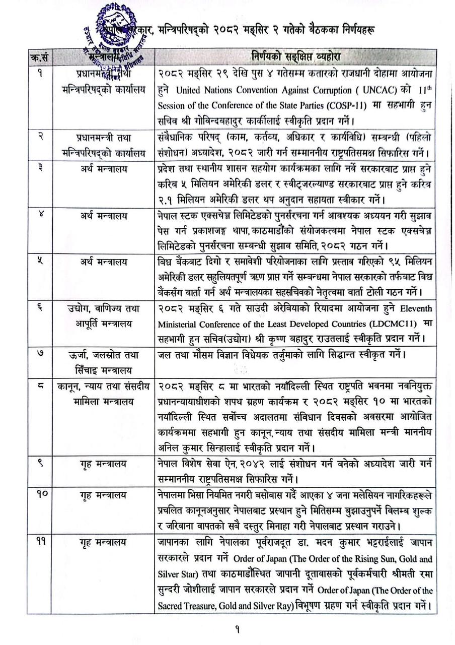 यसबाहेक, सरकारको अर्को महत्वपूर्ण निर्णयमा जल तथा मौसम विज्ञान विधेयक तर्जुमा गर्न सिद्धान्ततः स्वीकृति प्रदान गरिएको छ।