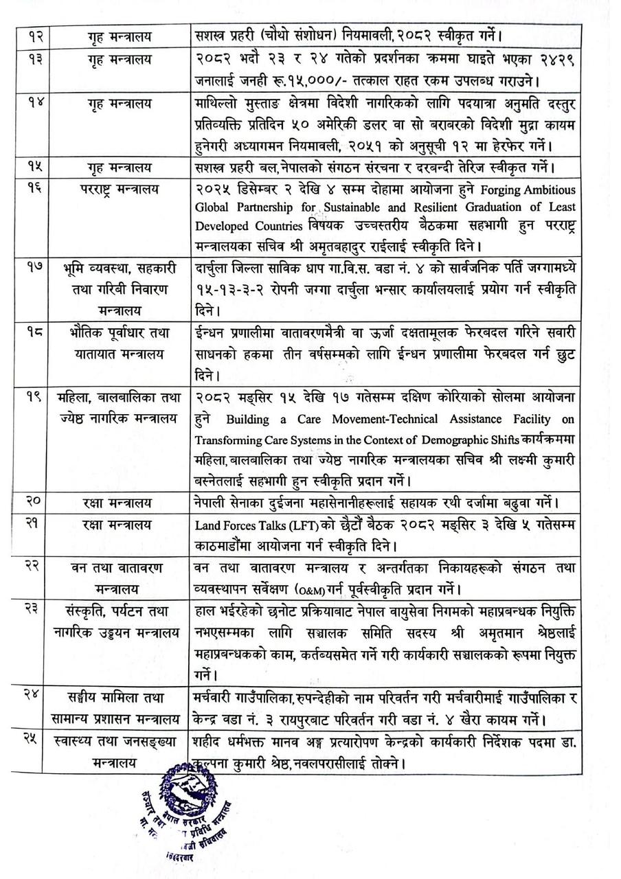 सुरक्षा क्षेत्रतर्फ, नेपाली सेनाका दुई जना महासेनानीलाई सहायक रथीमा बढुवा गर्ने निर्णय गरिएको छ। साथै ल्याण्ड फोर्स टकको छैटौं बैठक आगामी मंसिर ३ देखि ५ गतेसम्म काठमाडौंमा आयोजना गर्न स्वीकृति प्रदान गरिएको मन्त्रालयले जनाएको छ।