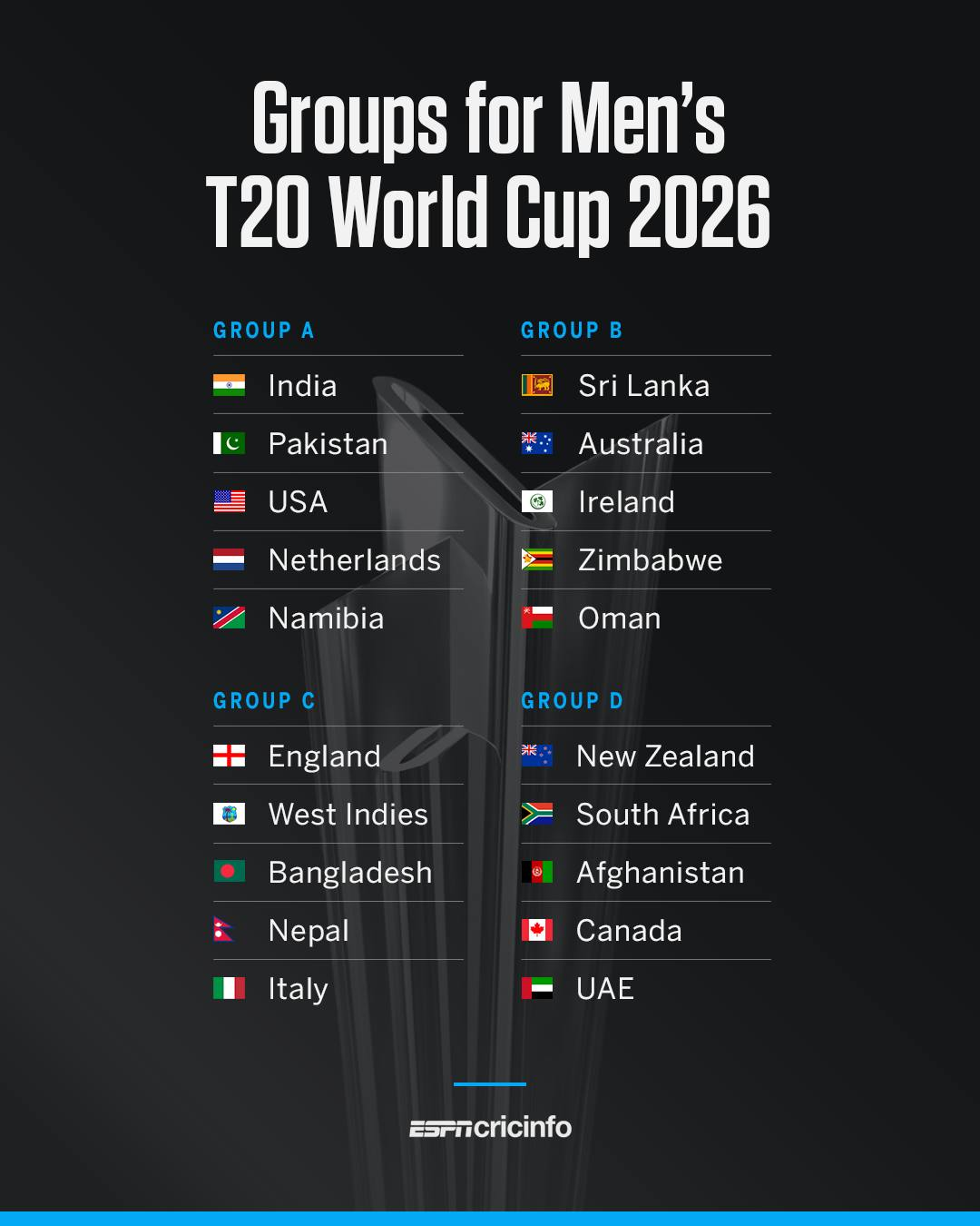 काठमाडौँ । भारत र श्रीलंकाले संयुक्त रूपमा आयोजना गर्दै गरेको आगामी वर्षको टी–२० विश्वकपका खेल तालिका अन्तर्राष्ट्रिय क्रिकेट परिषद् (आईसीसी)ले मंगलबार सार्वजनिक गरेको छ। सार्वजनिक तालिकाअनुसार नेपालले पहिलो खेल फेब्रुअरी ८ मा इंग्ल्यान्डसँग खेल्दै विश्वकप यात्रा सुरु गर्नेछ।