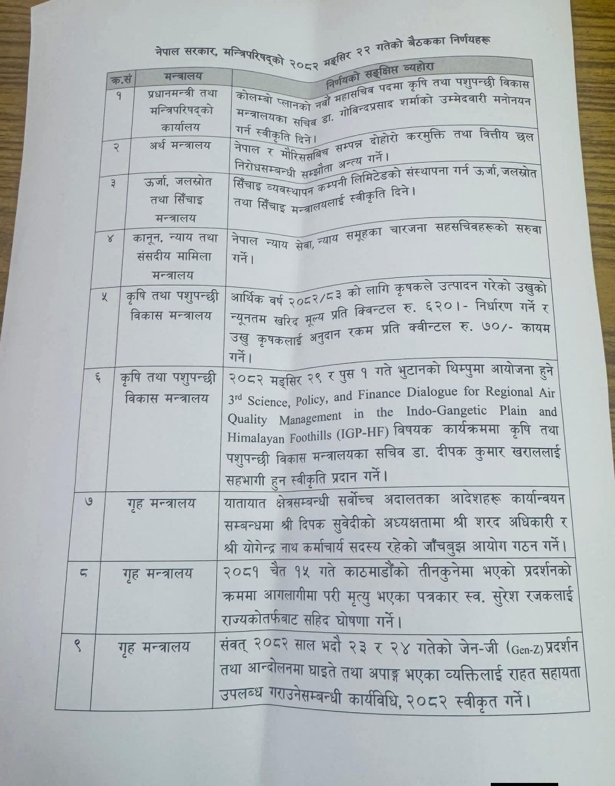 यस्तै, मन्त्रिपरिषद्ले आर्थिक वर्ष २०८२/८३ का लागि किसानले उत्पादन गरेको उखुको न्यूनतम खरिद मूल्य प्रतिक्विन्टल ६२० रुपैयाँ निर्धारण गर्ने निर्णय गरेको छ। साथै, उखु किसानलाई उपलब्ध गराइने अनुदान रकम प्रतिक्विन्टल ७० रुपैयाँ कायम गरिएको छ।